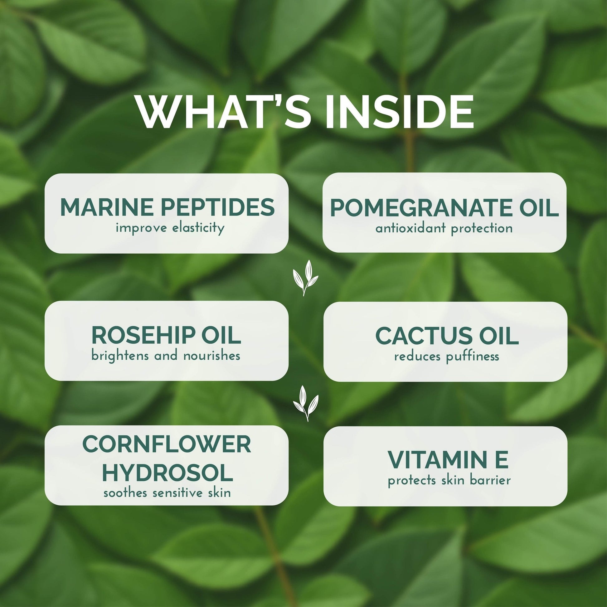 Ingredients: CENTAUREA CYANUS (CORNFLOWER) HYDROSOL*, PRUNUS AMYGDALUS DULCIS (SWEET ALMOND) OIL*, CETEARYL OLIVATE, SORBITAN OLIVATE, CETYL PALMITATE, SORBITAN PALMITATE, SIMMONDSIA CHINENSIS (JOJOBA) SEED OIL, PERSEA GRATISSIMA (AVOCADO) OIL*, HYDNOCARPUS (CACTUS) OIL*, ROSA CANINA (ROSE HIP) SEED OIL, TOCOPHEROL (VITAMIN E), LEUCONOSTOC/RADISH ROOT FERMENT FILTRATE, AESCULUS HIPPOCASTANUM (HORSE CHESTNUT) LEAF EXTRACT, PUNICA GRANATUM (POMEGRANATE) SEED OIL*, CITRUS GRANDIS (GRAPEFRUIT) SEED EXTRACT, ROSA DAMASCENA (ROSE) FLOWER ESSENTIAL OIL*.