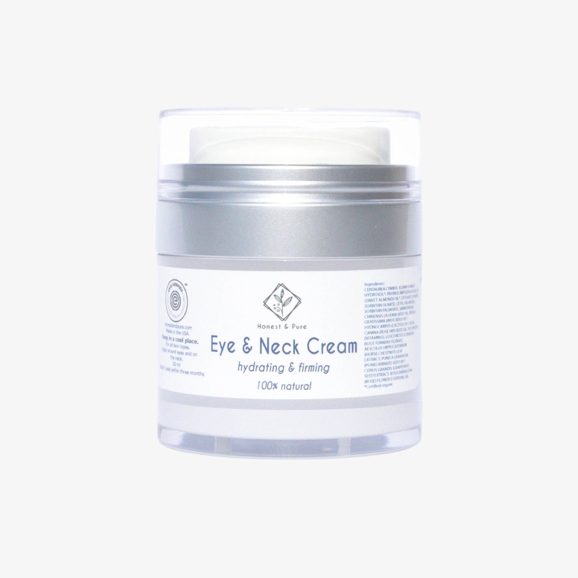 Experience the luxurious care your delicate skin deserves with Honest & Pure Eye & Neck Cream, a premium formula designed to rejuvenate and protect the eye areas and neck. Enriched with marine peptides, rosehip oil, cactus oil, and pomegranate oil, this multi-tasking cream works to treat dark circles, reduce fine lines and wrinkles, and visibly improve puffy under eye concerns.